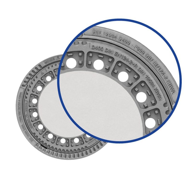 Bei einem Maßnormprodukt nach DIN 19584 müssen zwingend beide Bauteile korrekt mit der Maßnorm gekennzeichnet sein. Die Kennzeichnung ist auf der Oberseite von Rahmen und Deckel/Rost gut lesbar eingegossen. Ist nur ein Bauteil mit der Maßnorm gekennzeichnet, erfüllt das kompette Produkt nicht die Anforderungen an die Maßnorm.